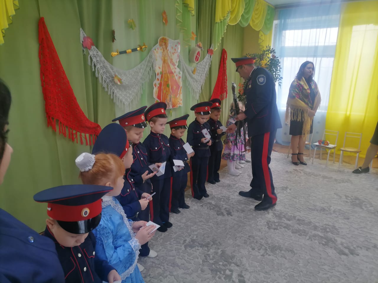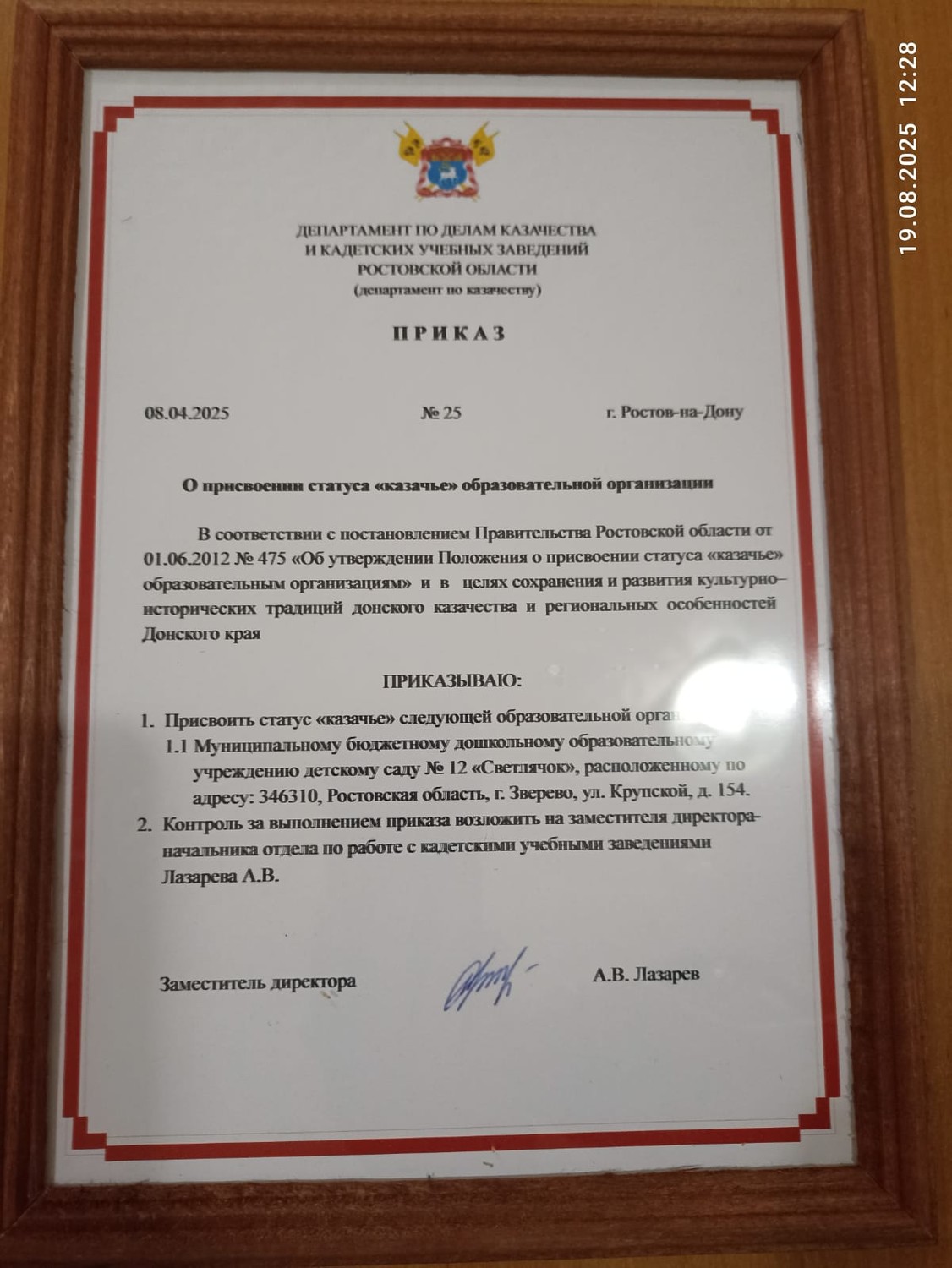 В рамках национального проекта «Молодежь и дети», государственной программы Ростовской области «Поддержка казачьих обществ Ростовской области», 8 апреля 2025 года детский сад № 12 «Светлячок» города Зверево был удостоен почетного статуса «Казачье». Вручение приказа о статусе прошло в мае 2025 года. Два образовательных учреждения города Зверево уже имеют статус «Казачий» - МБОУ СОШ № 5 имени атамана М. И. Платова и МБДОУ детский сад № 7 «Белочка». В учебные планы учреждений со статусом «Казачий» включены познавательные занятия по ознакомлению с историей и культурой донского казачества. В содержании музыкальных заня ... Читать дальше » Прикрепления: