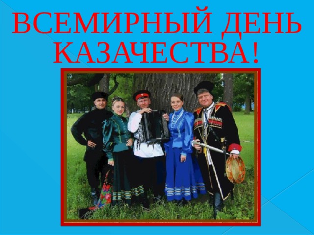 День казачества, получивший статус всемирного праздника, отмечается ежегодно во многих странах, хотя и без фиксированной даты. Учрежденный в 1989 году по инициативе ООН, праздник традиционно проводится во второй декаде ноября, хотя первоначально планировался на второй четверг месяца. Казачество, с его вольнолюбивым духом, отмечает событие в течение нескольких дней в различных уголках мира, превращая его в фестиваль с участием всех желающих. Прикрепления:
